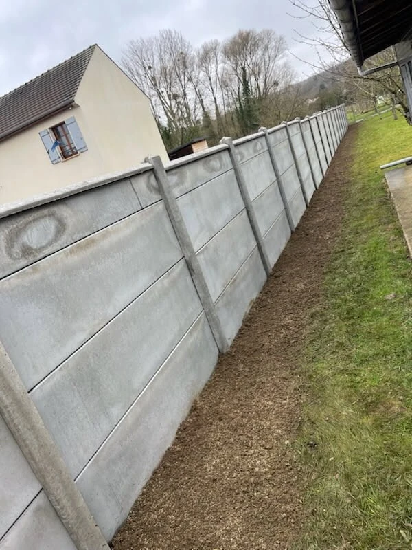 Réalisation d'une clôture béton gris d'une longueur de 31 ML sur la commune de Longeuil Annel, hauteur 1m75, finition d'un chaperon en partie haute.