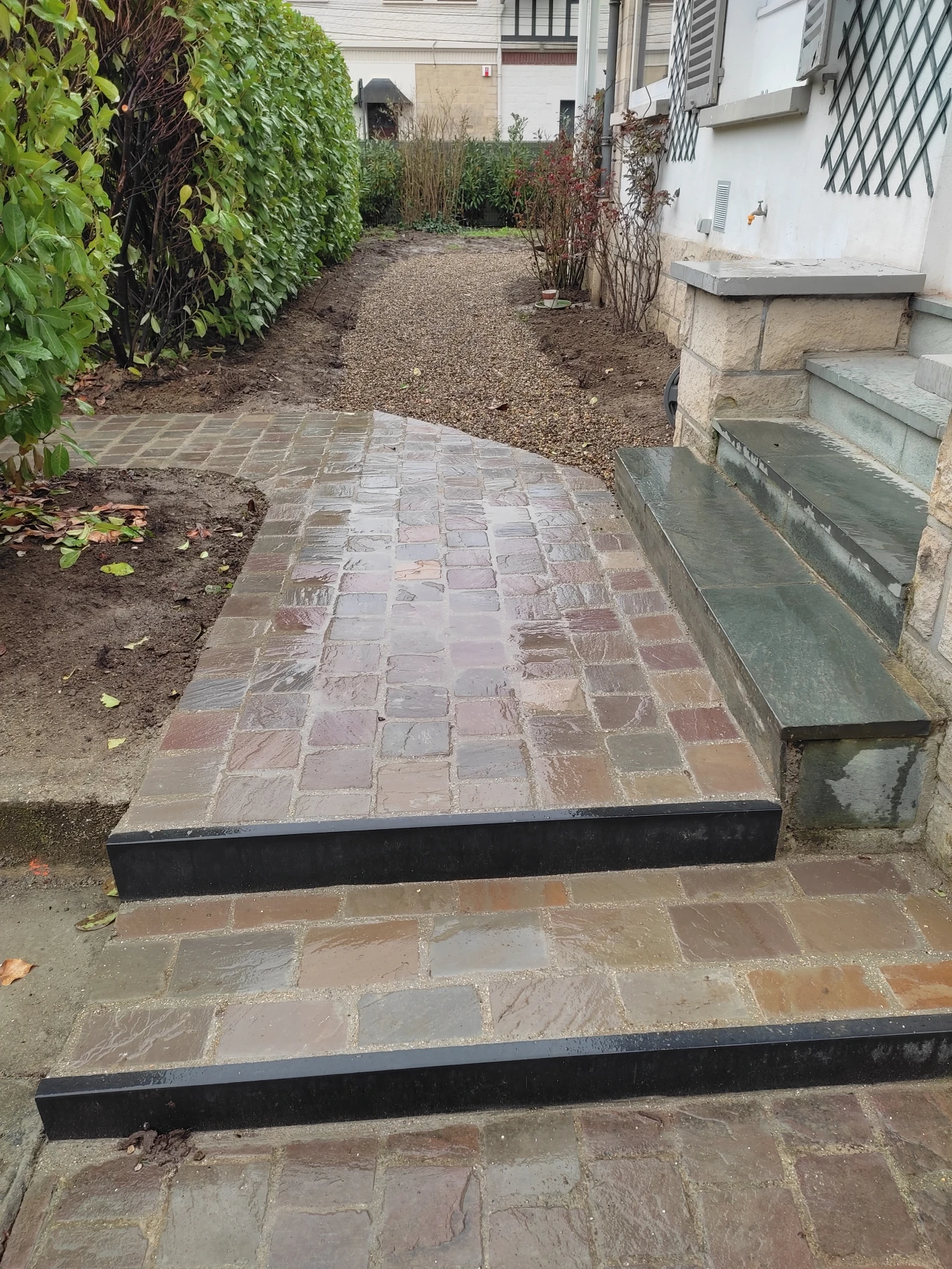 Réalisation d'une nouvelle allée pavée en pavés Grès d'Inde sur Chantilly